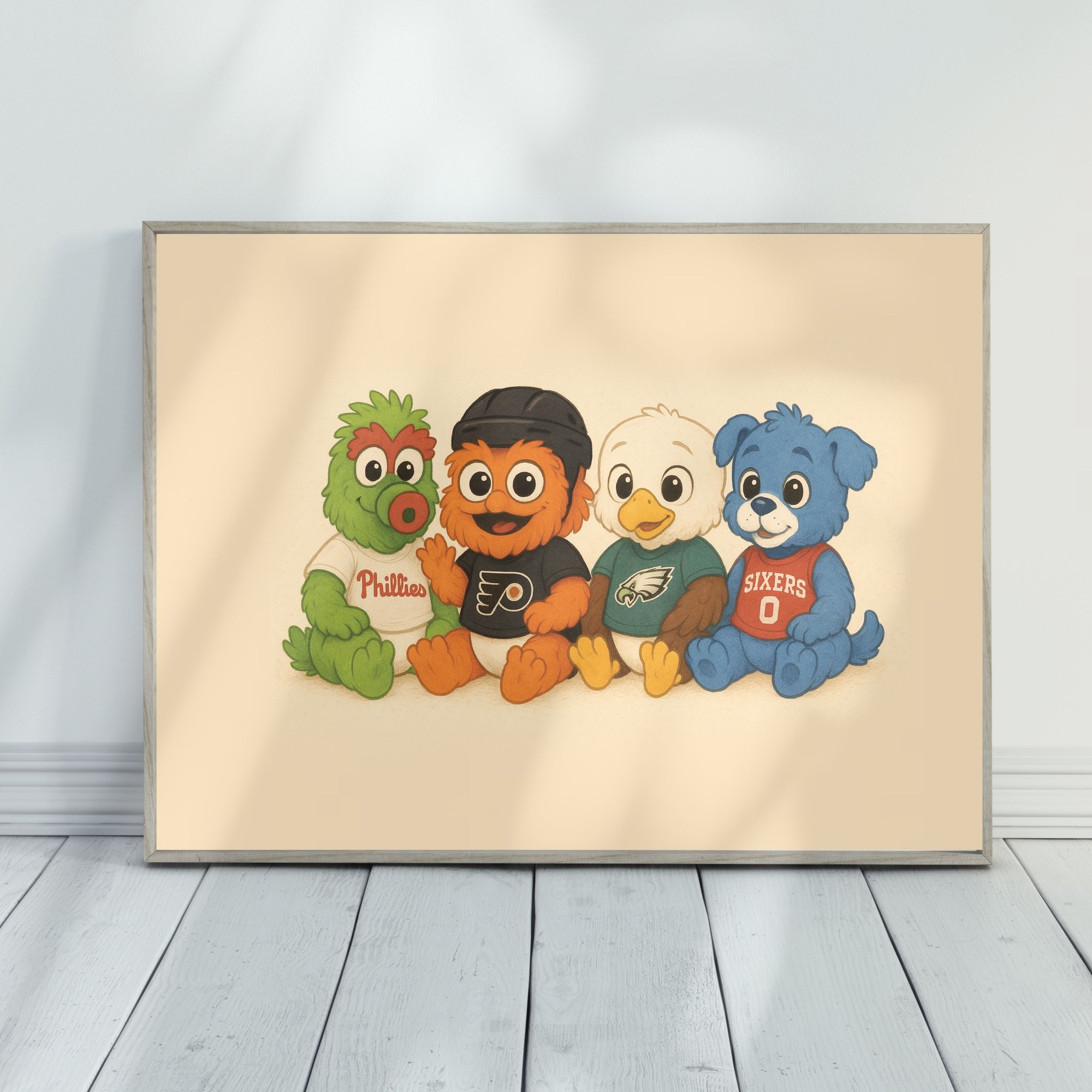Celebrate your love for Philadelphia sports with this adorable Philly Mascot Babies Nursery Print! Perfect for fans of the Phillies, Eagles, Sixers, Flyers, and all things Philly, this vibrant digital instant download poster combines playful charm with team spirit. Whether you're decorating a kid’s nursery, game room, or sports-themed space, this stylish wall art showcases iconic team mascots in a cute, modern design that captures the excitement of Philadelphia sports.