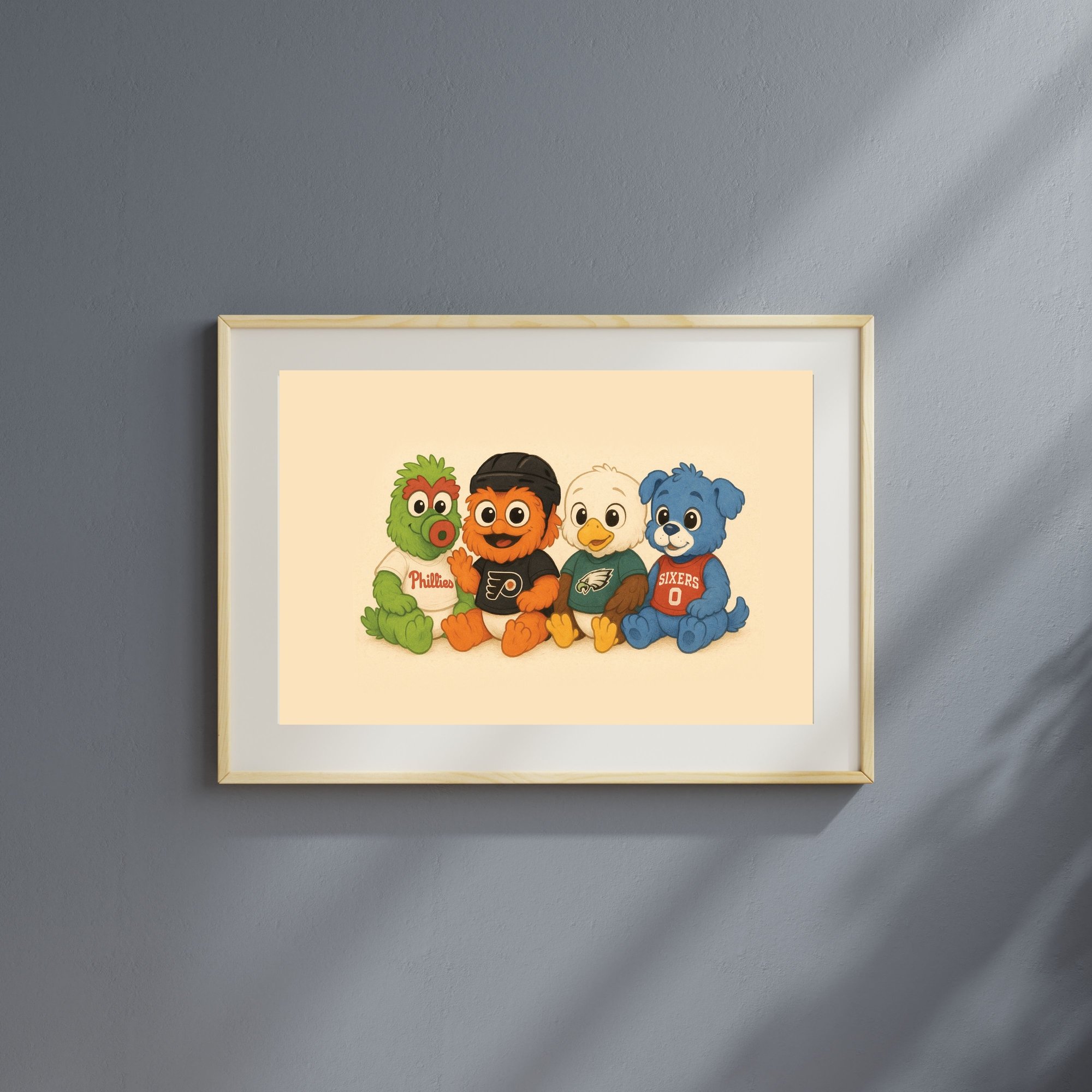 Bring a fun and spirited touch to your space with this unique Philly poster, celebrating the beloved mascots of the Phillies, Eagles, Sixers, and Flyers. Add a pop of color and personality to your home or gift it to the ultimate Philly sports fan today!